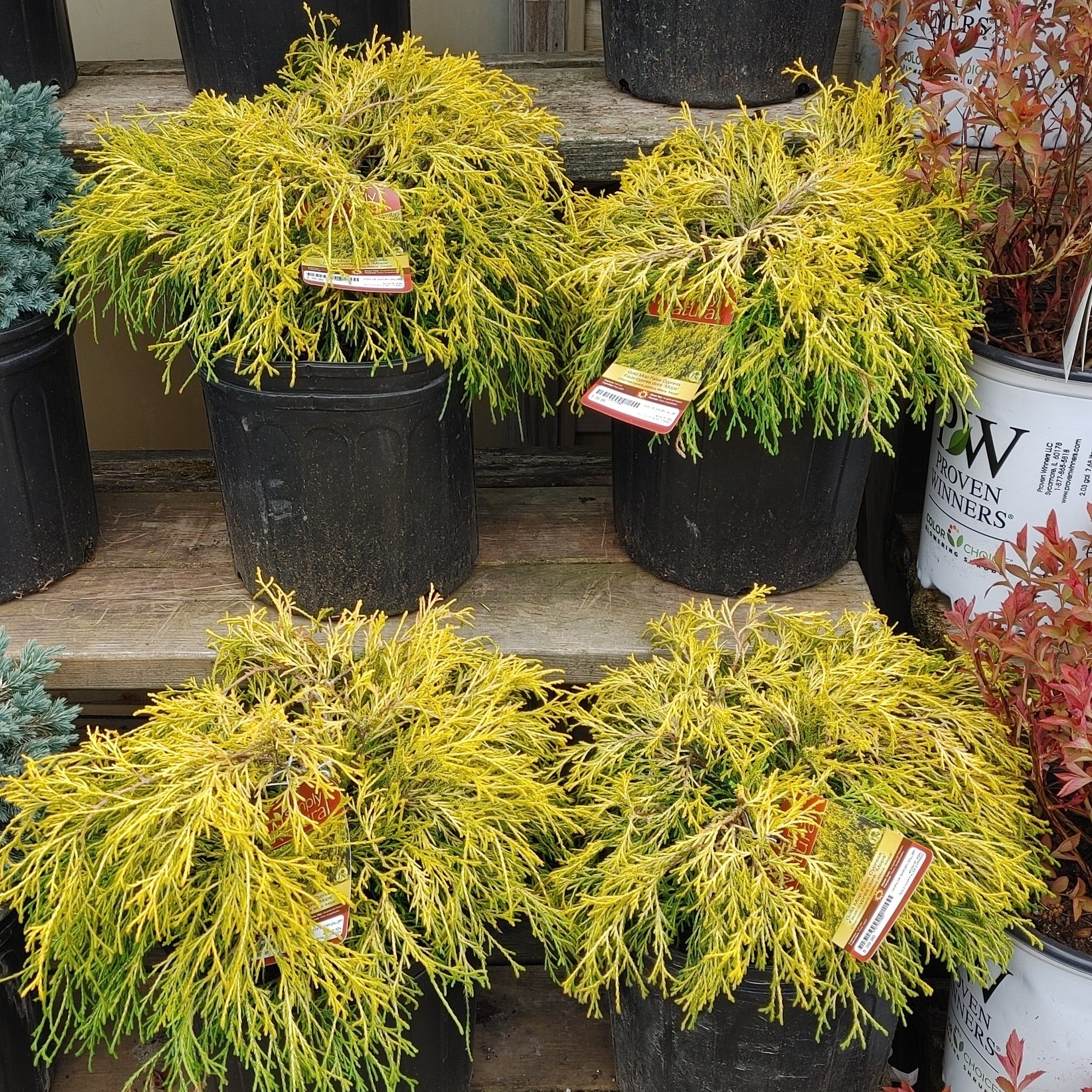 A ground-hugging mound that is truly mop-like, with stringy leaves that color best in full sun. A superior accent to add contrast to dwarf green conifer plantings. Tailored to rock gardens and slope plantings as well as Asian garden schemes. Evergreen.