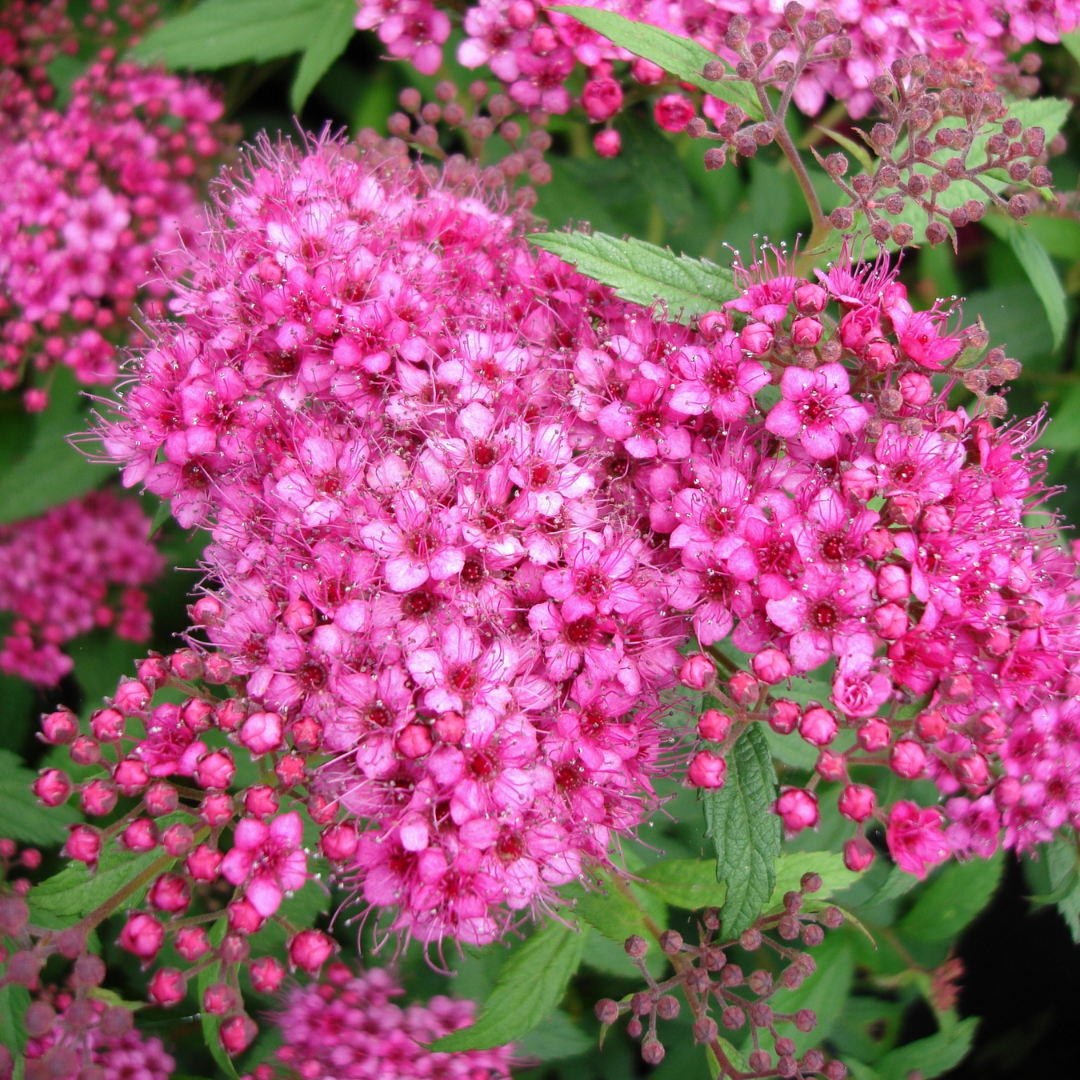 Flat-topped heads of rosy pink flowers cover this low, spreading shrub. New spring foliage is an attractive reddish purple.