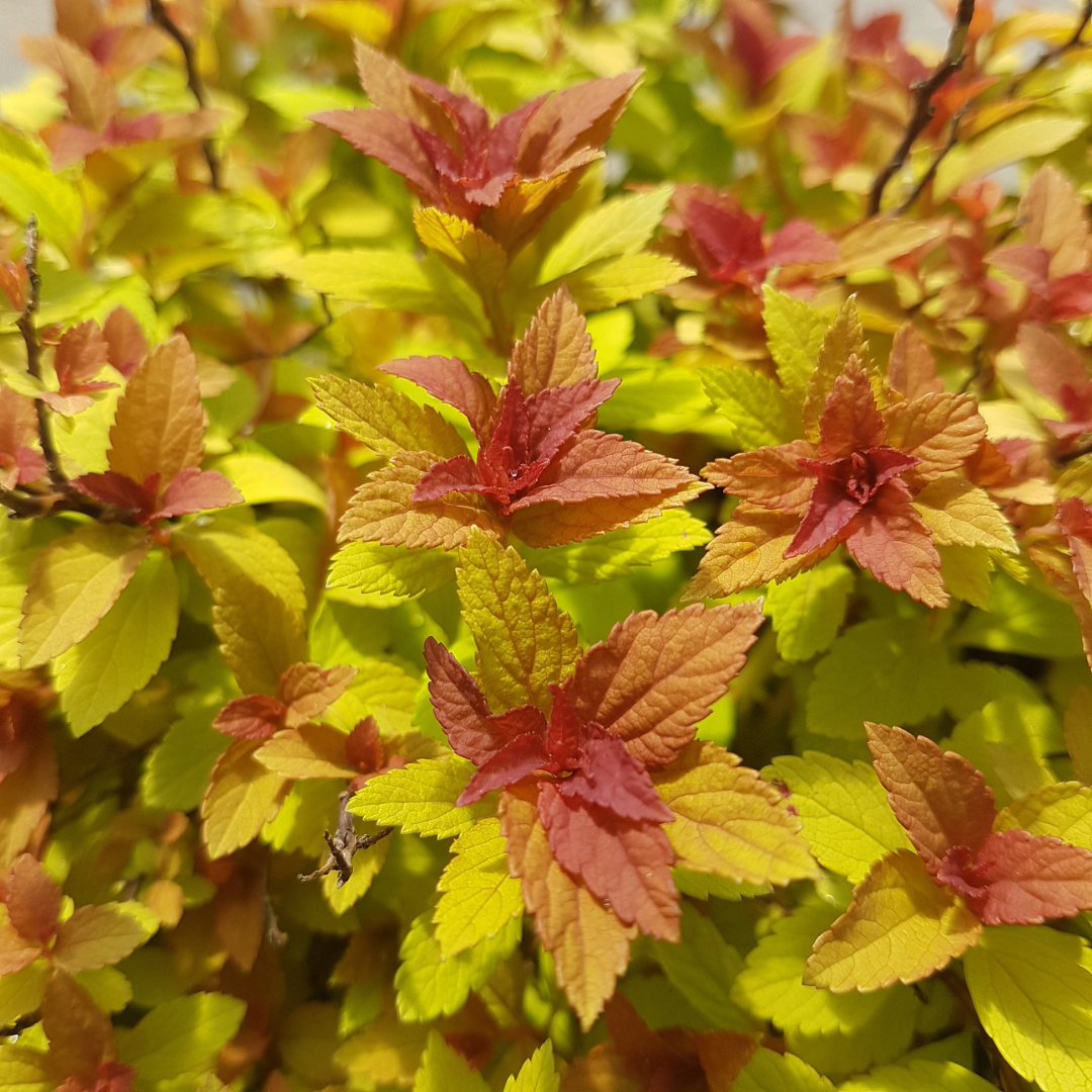 New growth emerges bright red in the spring maturing to gold accented with deep pink flower clusters from late spring through summer. Rich rust red and bronze shades give beautiful fall colour. A low and spreading growth habit is useful to break up swathes of green, in masses, or as a colourful border.