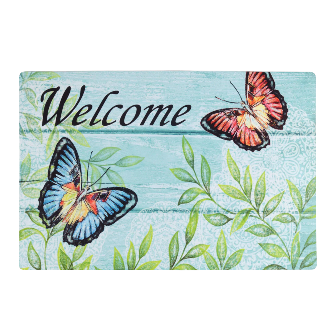 The Welcome butterfly doormat features beautiful butterflies and plants to bring in the spring season.