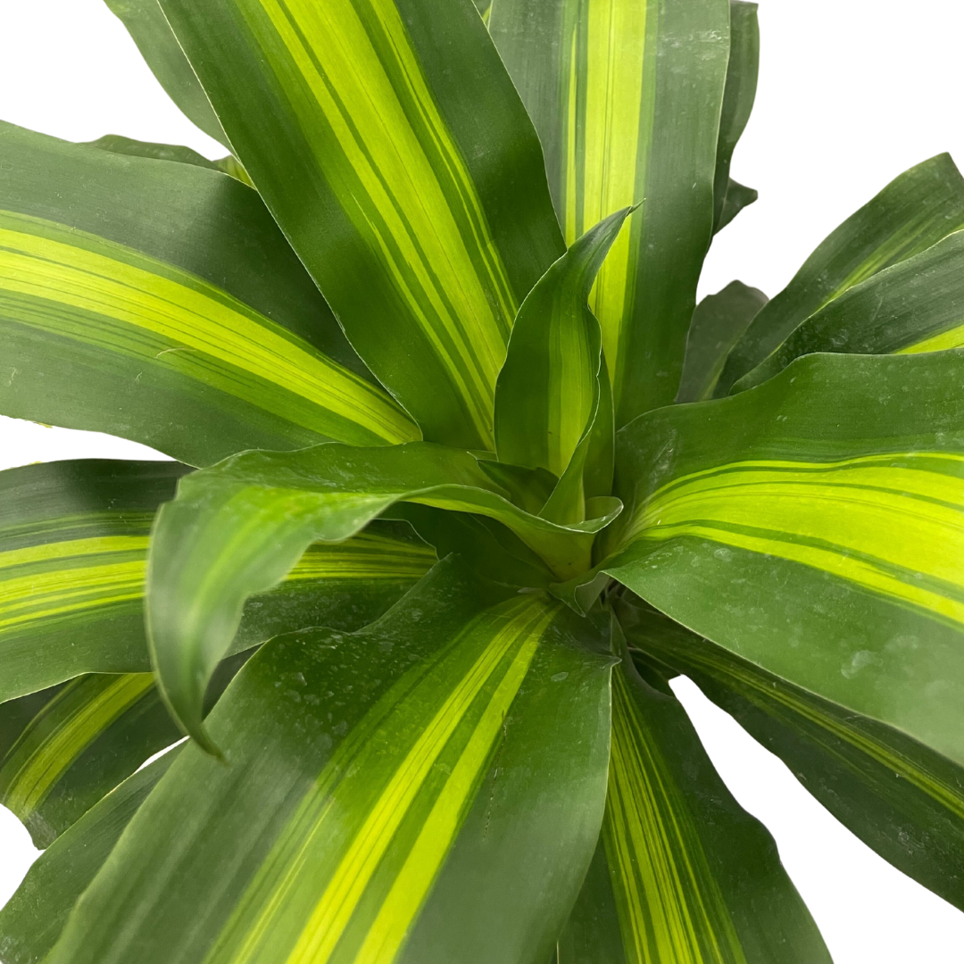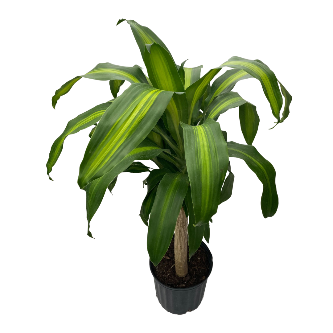 The Dracaena Massangeana Cane (Corn Plant) derives their common name for the upright growth and graceful, variegated leaves that resemble corn foliage. Their tall height fills up the air space to enjoy from below or from a balcony looking down. Their colorful striped foliage makes an attractive addition for roomy interiors with medium to bright light. Add humidity and keep moist (but not soggy) to give them optimum results.
