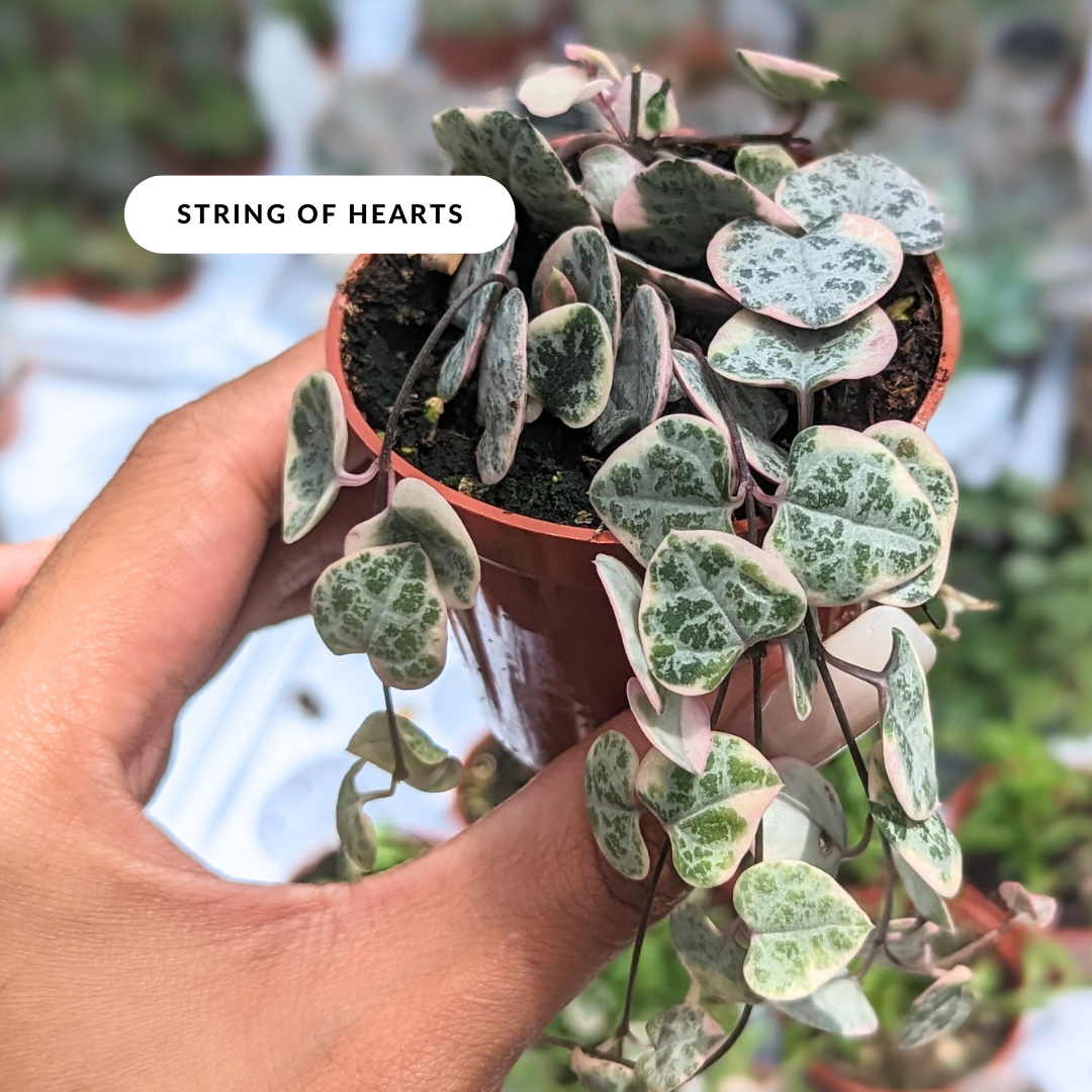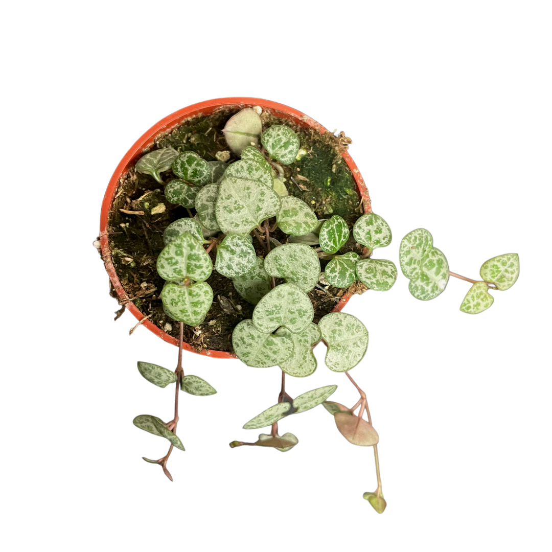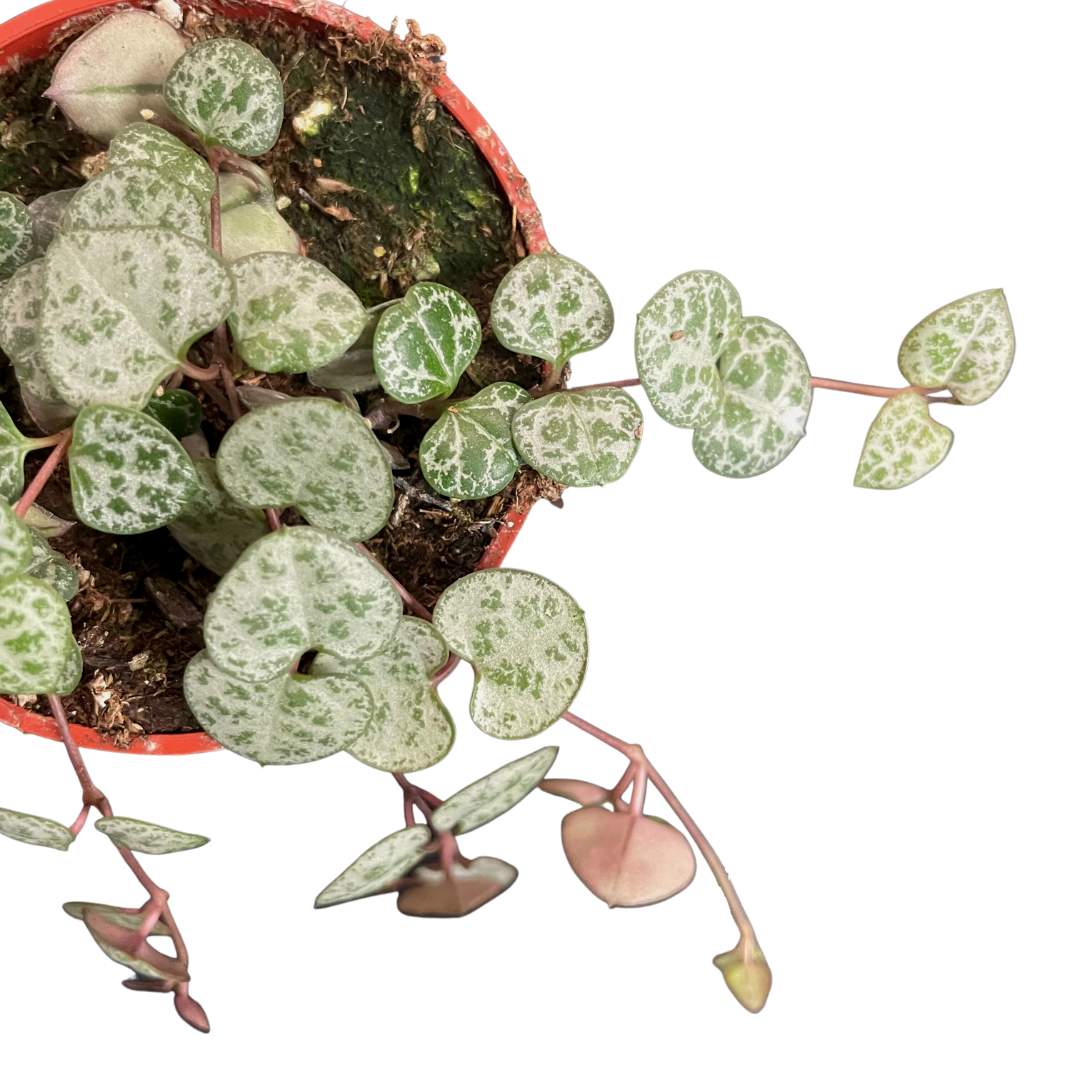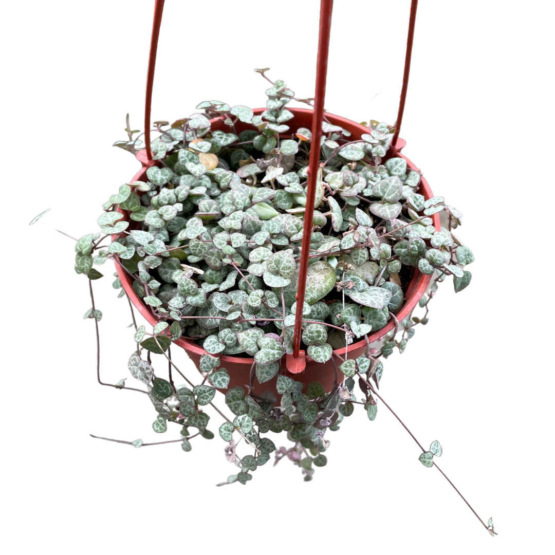 These trailing vine is perfect for hanging baskets. The Ceropegia woodii features heart-shaped grey-green foliage with shades of pink. A fast-grower and will hang several feet at maturity.