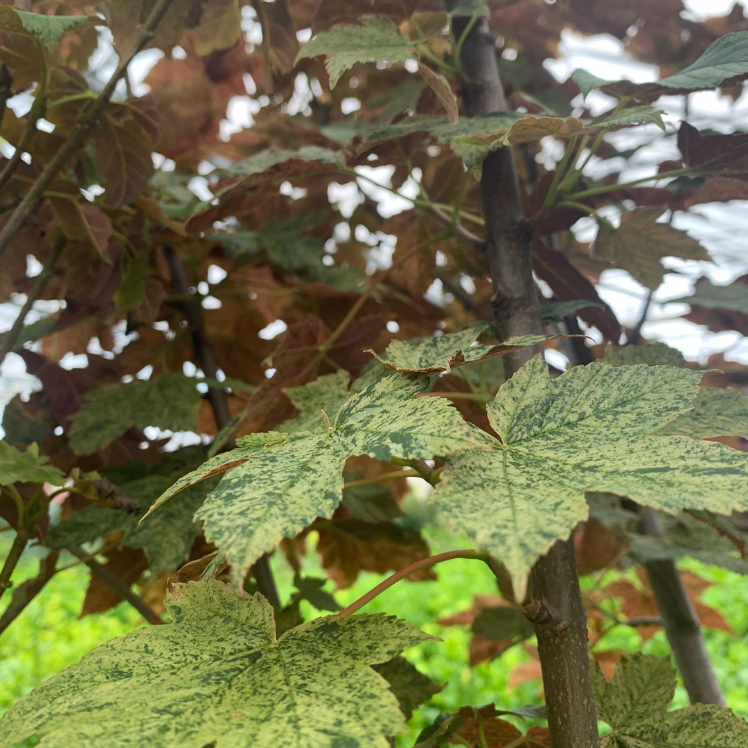 Emerging leaves in spring are orange-pink that mature to shades of deep green, splashed with cream, tan, and pink, with maroon undersides. Fall colours are bright yellows to oranges. Foliage colour varies with sun exposure.
