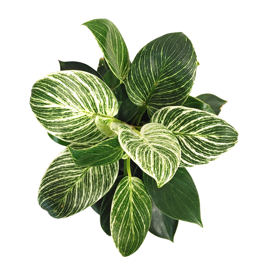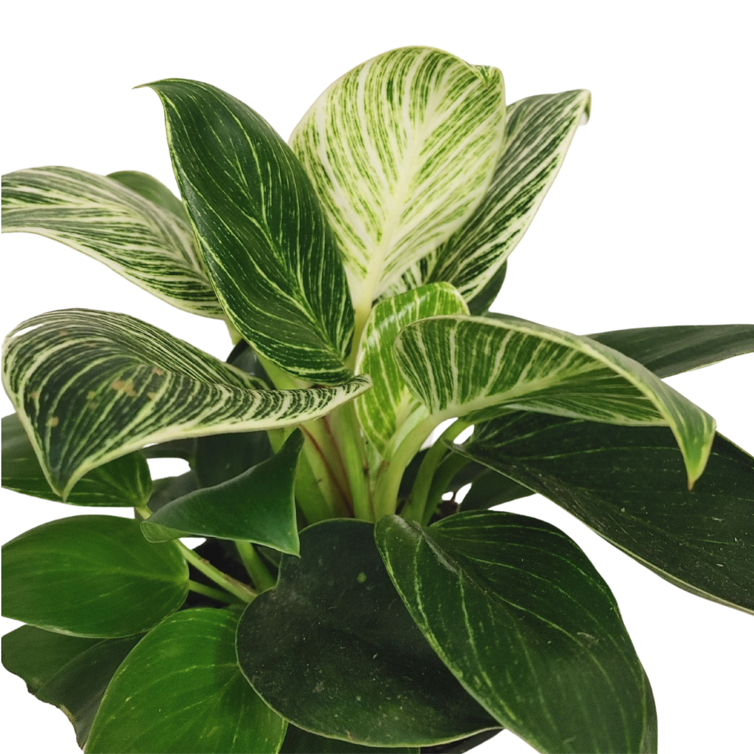 The Philodendron Birkin features round leaves with pointed tips. They are deep green with white pinstripes and variegation.