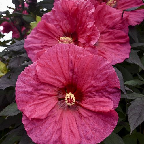 Huge 8”, puckered hot pink flowers cover a round, dense habit of near black foliage. A must have statement piece for your garden!