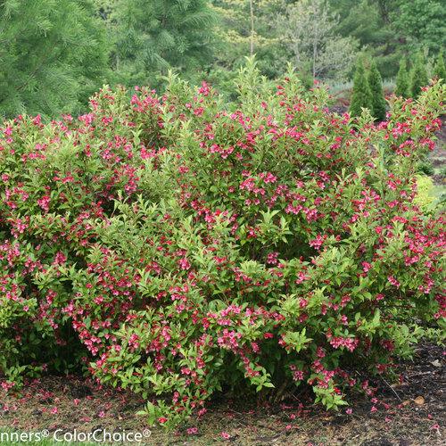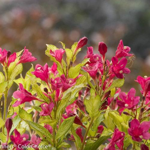 Sonic Bloom® Ghost® weigela has bright pink/red flowers and uniquely colored foliage, which starts out lime green and develops an unusual, bright golden glow through the summer.