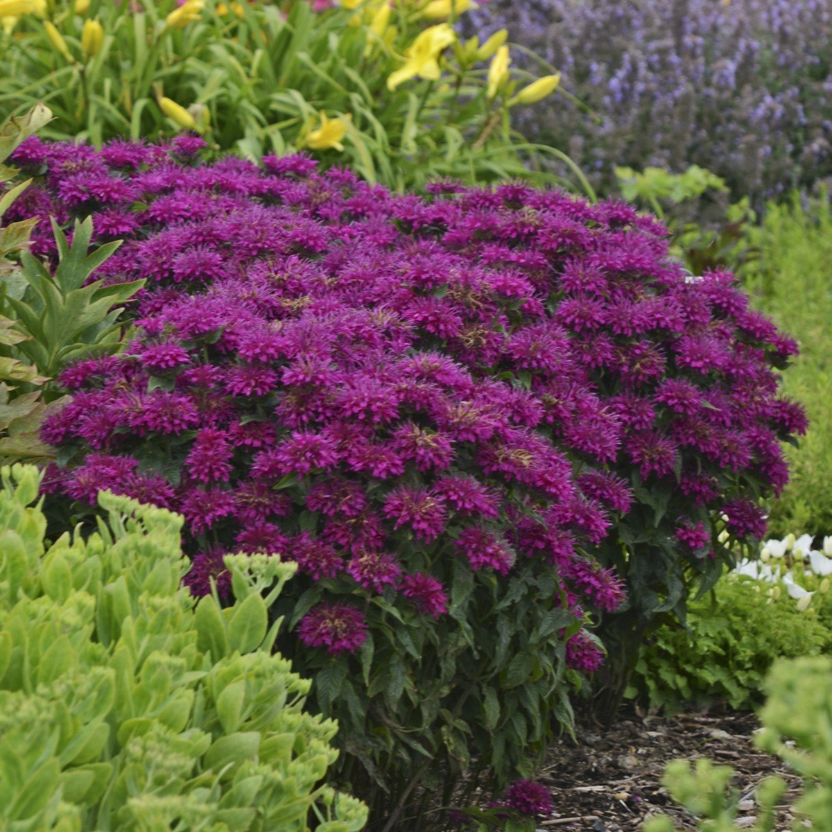 Compact, Monarda 'Grape Gumball' (Bee Balm) is a clump-forming perennial boasting vibrant magenta flowers, 2 in. across (5 cm), borne in dense, globular terminal heads. Blooming for weeks from mid to late summer, they rest upon a whorl of decorative bracts and attract scores of butterflies and hummingbirds.