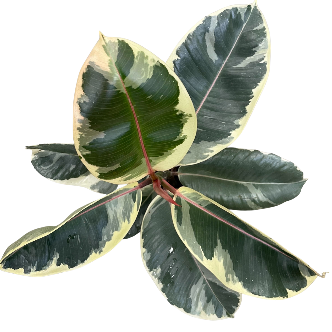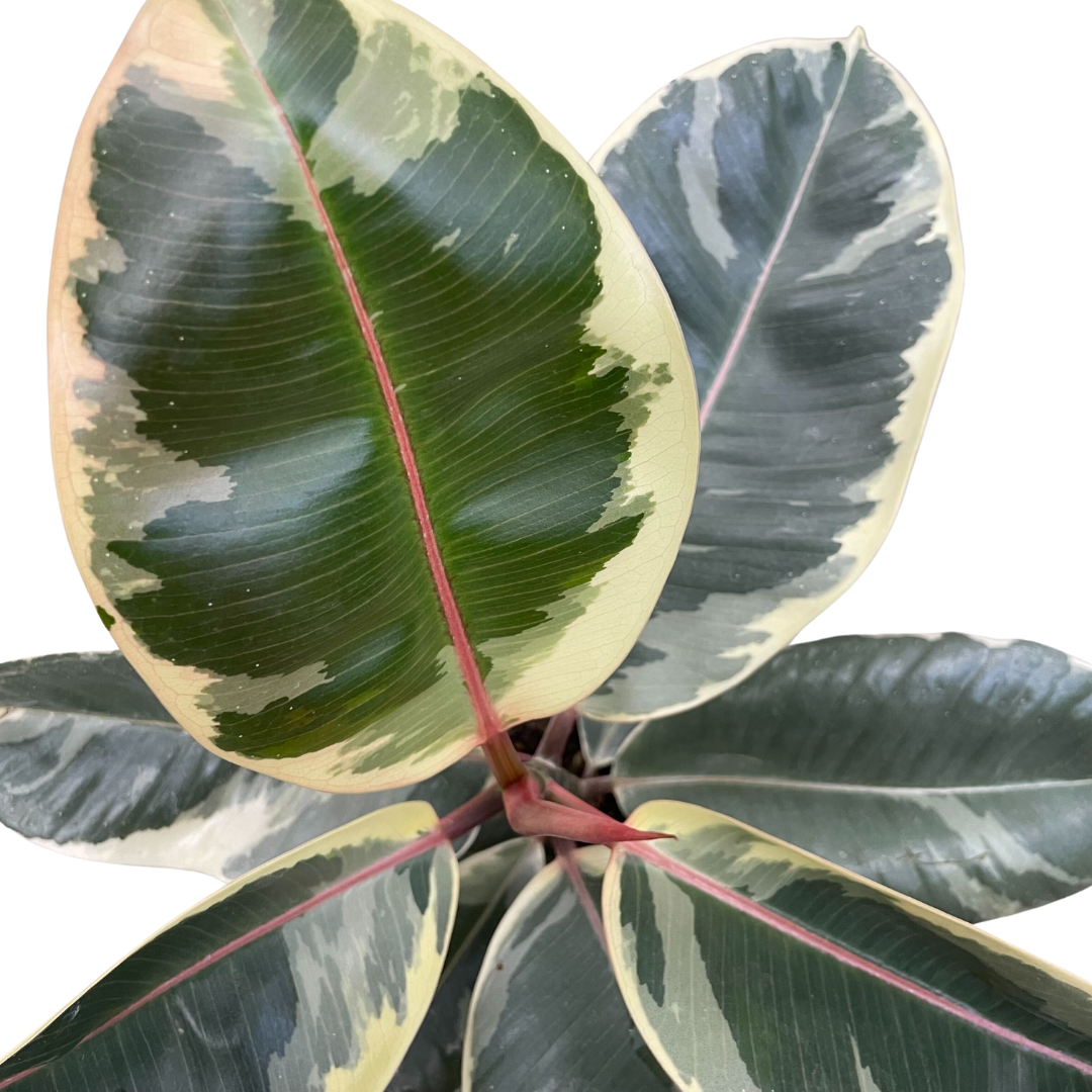 The variegated rubber plant, as it's sometimes known, often features striking reddish-pink tones on the outside of the green and cream foliage, and the sheath at the top of the stem is also a deep burgundy-red color.