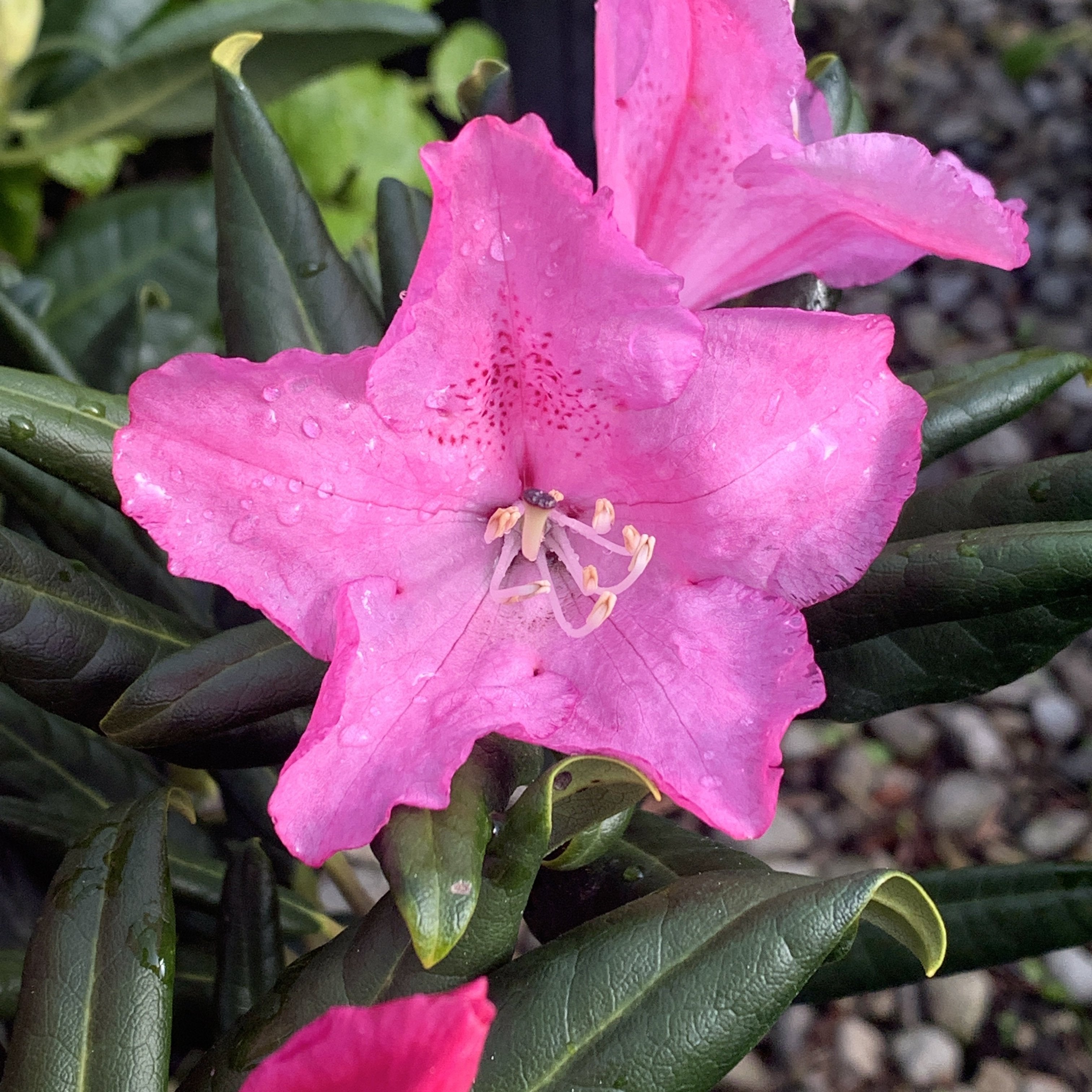 Extremely hardy selection displays large trusses of lightly scented, deep pink blooms with orange-red specks. Dense, dark green glossy foliage is tinged red upon emerging in spring. Upright rounded form makes a nice background to finer textured plants. Evergreen.