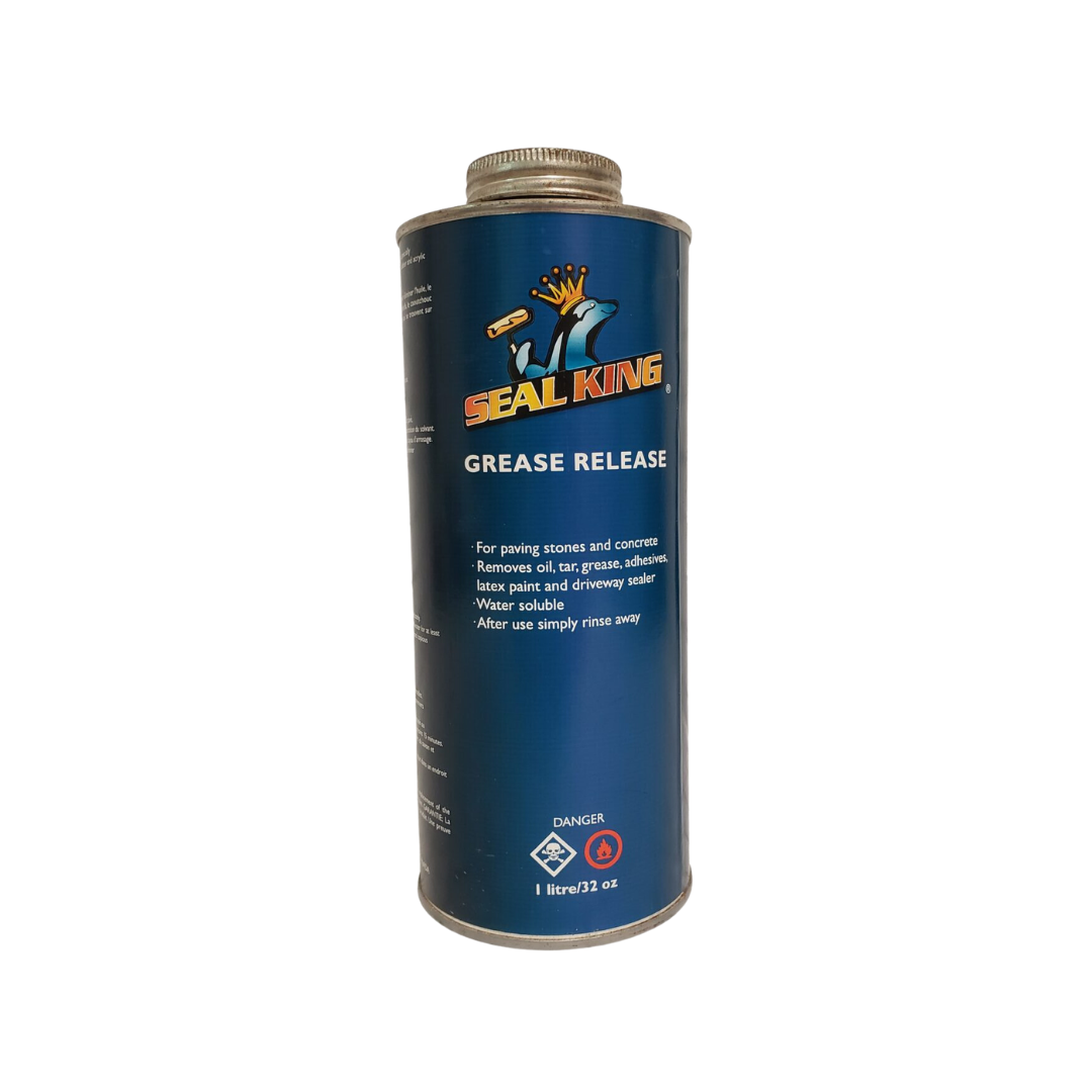 Seal King’s Grease Release is a solvent-based cleaner.  It is specially formulated to remove oil, tar, coal tar, latex print, adhesives, rubber and acrylic driveway sealers from concrete surfaces.