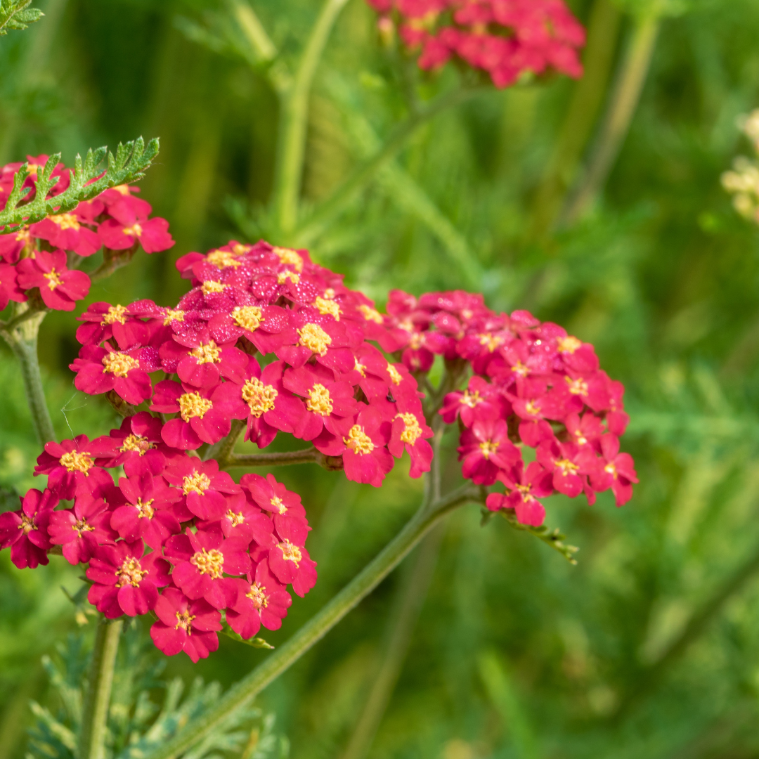'Paprika' yarrow is an excellent hybrid variety that blooms with large clusters of bright red flowers surrounding a distinctive yellow eye. The flowers mature to pink creating a beautiful multi-colored effect in the garden.